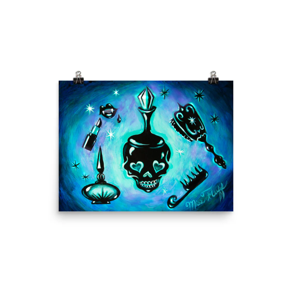 Art Print featuring a glowing goth vanity with a skull perfume bottle,